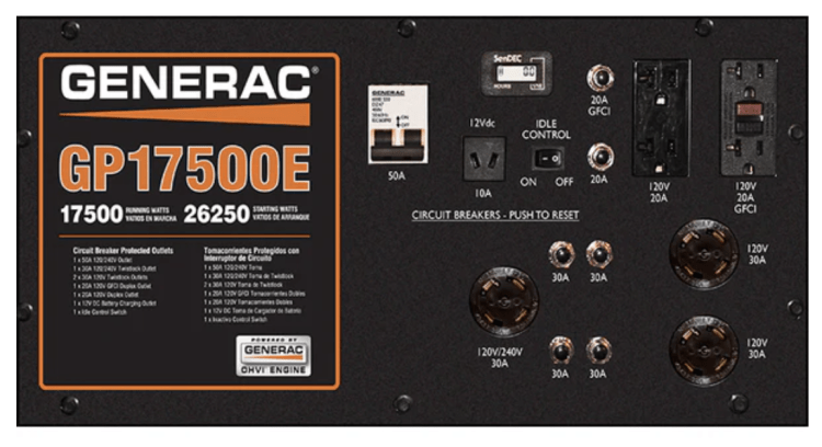 With an impressive 17,500 starting watts and 26,250 surge watts, the Generac 17,500E can handle multiple tools, appliances, or critical systems at once. Its electric start system makes operation quick and easy, while the rugged frame and heavy-duty wheels allow for transport around jobsites or properties.