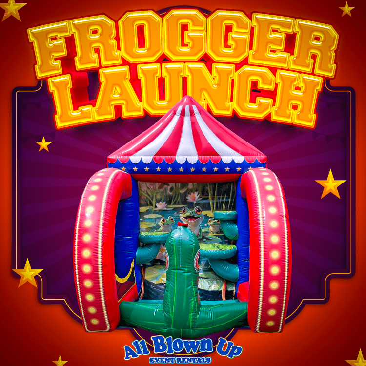 Frogger Launch is a fun and eye-catching inflatable carnival game that puts a playful twist on classic midway challenges. Players launch safe rubber frogs into the air, aiming to land them on elevated lily pads to score points and show off their precision and timing.